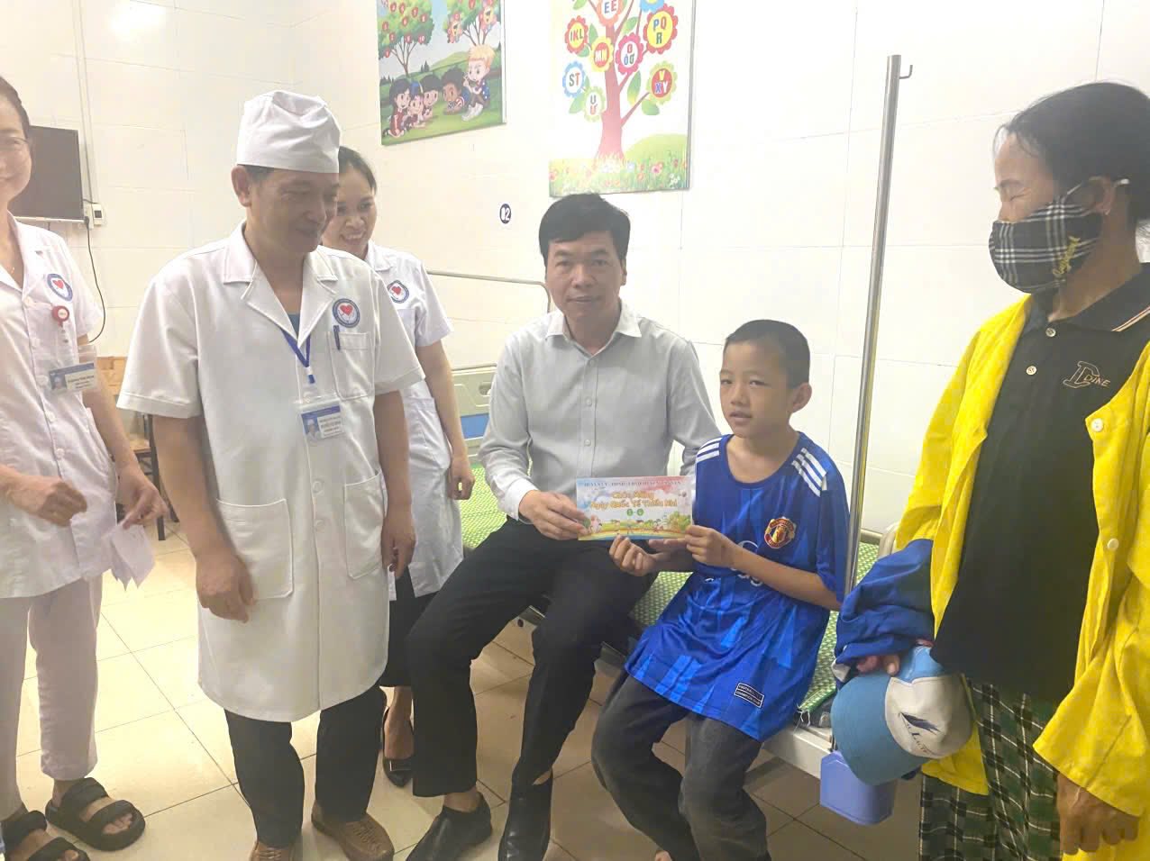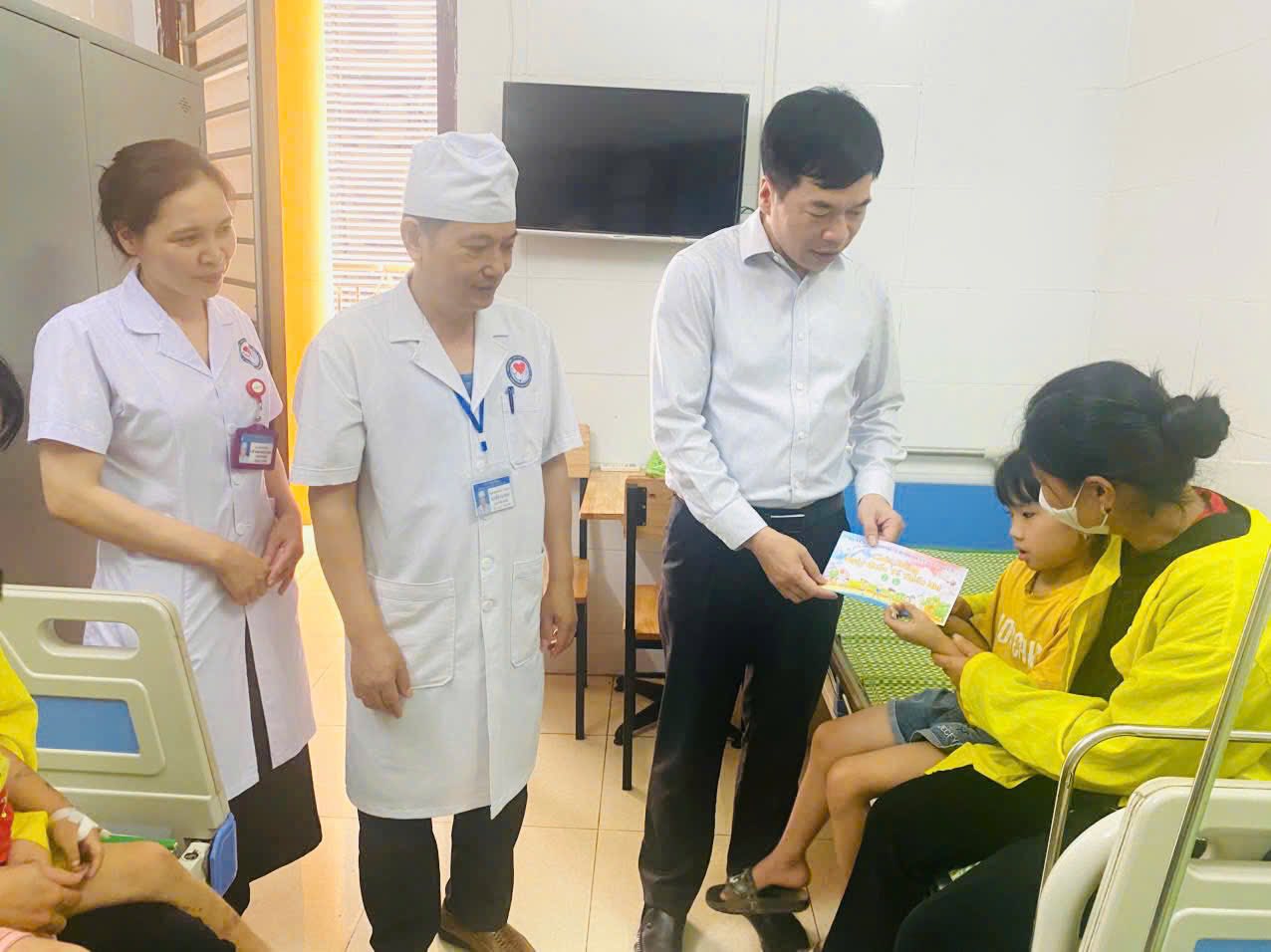 Với mong muốn chia sẻ, khích lệ tinh thần cho các em nhỏ và gia đình, tạo bầu không khí ngày Quốc tế Thiếu nhi ấm áp, gần gũi, vui vẻ, đồng chí Nguyễn Viết Toàn – Bí thư Huyện uỷ cùng các đồng chí trong đoàn công tác đã đến từng giường bệnh thăm hỏi, động viên và tặng quà cho các bệnh nhi đang điều trị tại Trung tâm với 10 suất quà đặc biệt, mỗi suất trị giá 500.000 đồng cho 10 bệnh nhân nhi có gia đình hoàn cảnh khó khăn và 01 thùng quà bánh kẹo cho các bệnh nhân nhi toàn trung tâm.
