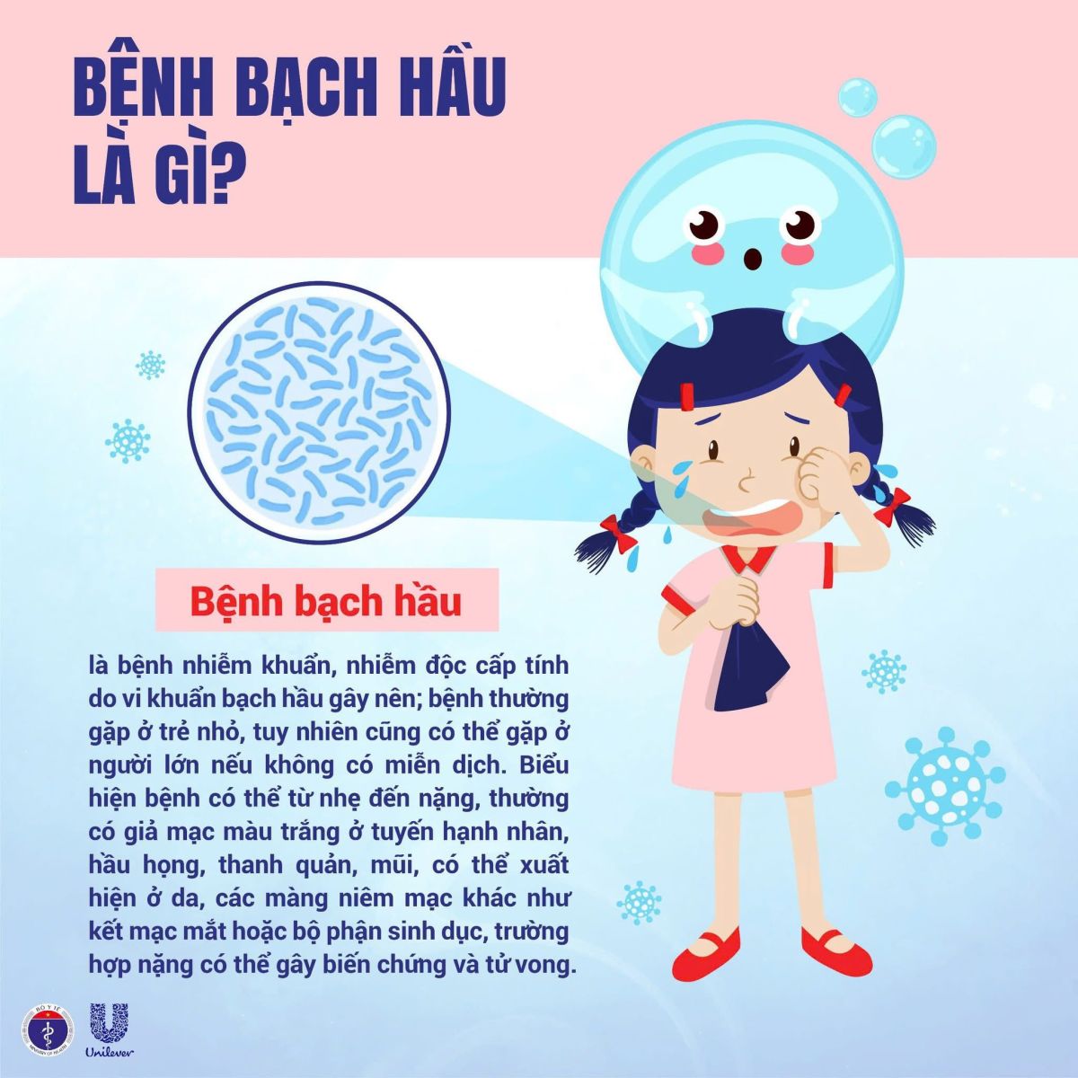 Bạch hầu là bệnh nhiễm khuẩn, nhiễm độc cấp tính do vi khuẩn bạch hầu gây ra. Bệnh thường gặp ở trẻ nhỏ, nhưng người lớn chưa có miễn dịch cũng có thể mắc. Đặc trưng của bệnh là xuất hiện giả mạc màu trắng ở hầu họng, thanh quản, mũi… Trường hợp nặng có thể gây biến chứng nguy hiểm, thậm chí tử vong.