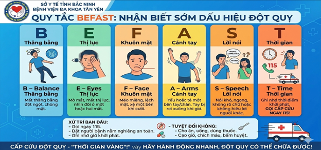Đột quỵ thường xảy ra đột ngột khi người bệnh đang sinh hoạt hoặc làm việc bình thường. Quy tắc BEFAST là công cụ giúp cộng đồng nhận biết nhanh các triệu chứng để kịp thời hành động: